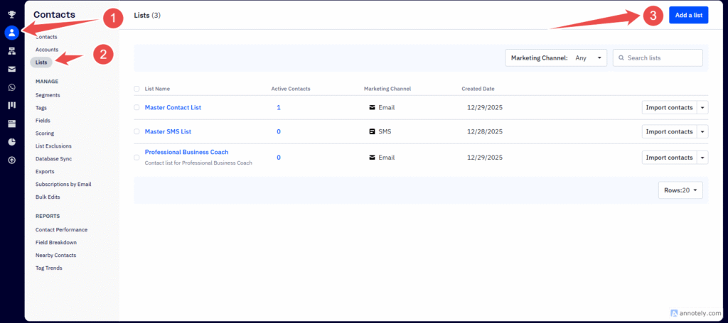 4. On the Right Click on “Add List” Button