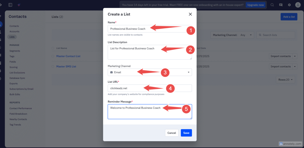 2. Enter a name for your list (for example: ClickLeadz – Professional Business Coach).
