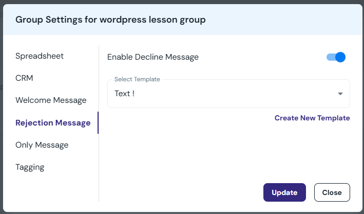 ClickLeadz allows you to automatically send a private rejection message to members you decline — helping you stay polite, professional, and clear about your group criteria.